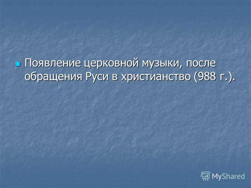 Появление церковной музыки, после обращения Руси в христианство (988 г.). Появление церковной музыки, после обращения Руси в христианство (988 г.).
