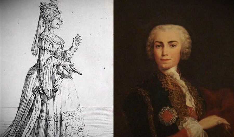 Портрет самого известного кастрированного певца Карло Фаринелли, карикатура на него же в женской роли (1724 год)