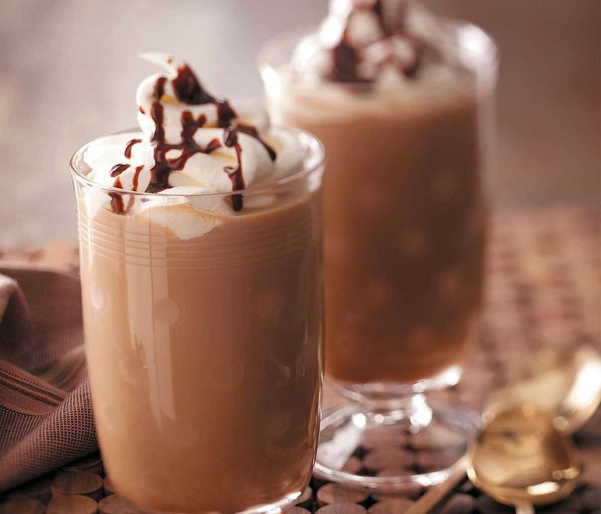 При взбивании напитка добавьте тертый шоколад — около 20 грамм, а также натуральный мед — около 5 грамм. Смесь, как обычно, влейте в стакан с колотым людом, а в качестве украшения используйте шоколадную крошку или ягоды — свежую или замороженную клубнику, вишню, малину или даже клюкву.