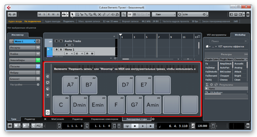 В-четвертых, стоит обратить внимание на программу Cubase Elements . Там, помимо стандартного набора функций, есть еще панель аккордов, которая позволит создать трек «с нуля» или «довести до ума» ранее сделанную запись, применив ранее изученные полифонические приемы на практике: