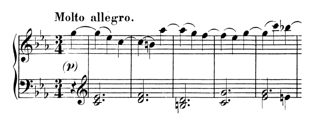 Заголовок говорится смело октав , дважды встречается в первые 8 барах. Субъект не остается сильным до перехода , при котором открывающий мотив взят на октаву выше, а масштаб -типа прохода модулирует ключ к относительно крупной , E ♭ главный. Во втором сюжете есть несколько очень изящных мелодий, поддерживаемых басом Альберти , которые продолжаются до второй половины произведения. В этом разделе для формирования разработки используются материалы по первому и второму предметам . Самая нестабильная секция по гармонии, проходит в тональности до мажор., Фа минор , соль минор и возвращение к исходной партии до минор. Перепросмотр происходит от бара 100 до 168, на этот раз второй объект находится минор вместо Е-бемоль мажор экспозиции, и Coda заканчивает кусок от бара 168 до 185.