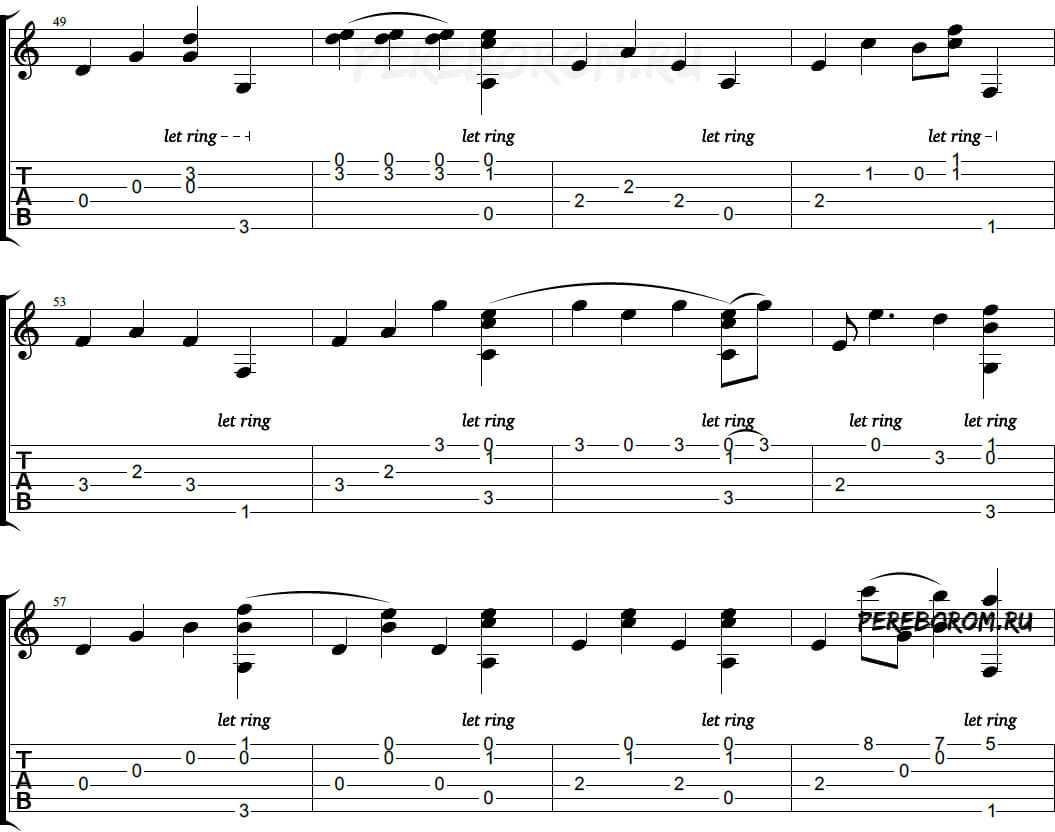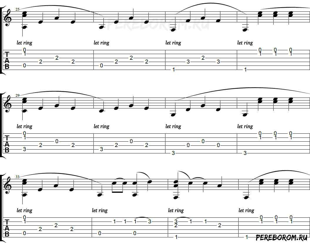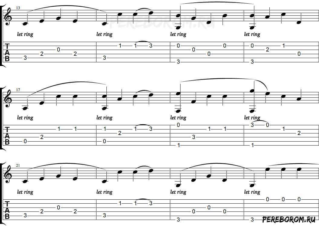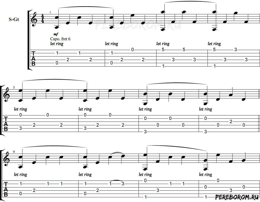 Сначала одновременно дёргаем бас и мелодическую ноту (1 лад на 2-ой струне – отсчёт теперь ведём от каподастра). Мелодию извлекаем безымянным пальцем. Затем указательным 2 лад на 4-ой стр. Таким способом играется вся песня. Конечно мелодия и средний голос ритмически изменяются и нужно за этим следить. Часто здесь используются аккорды в тональности – например, в 1-2 тактах — Am, 6-7 — G и т.д.