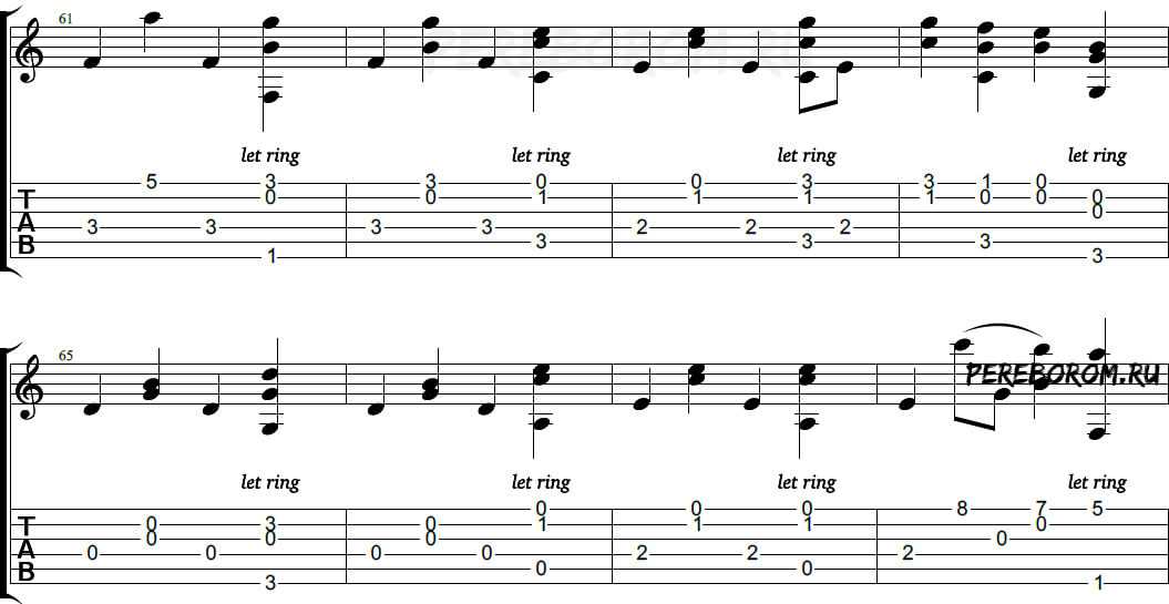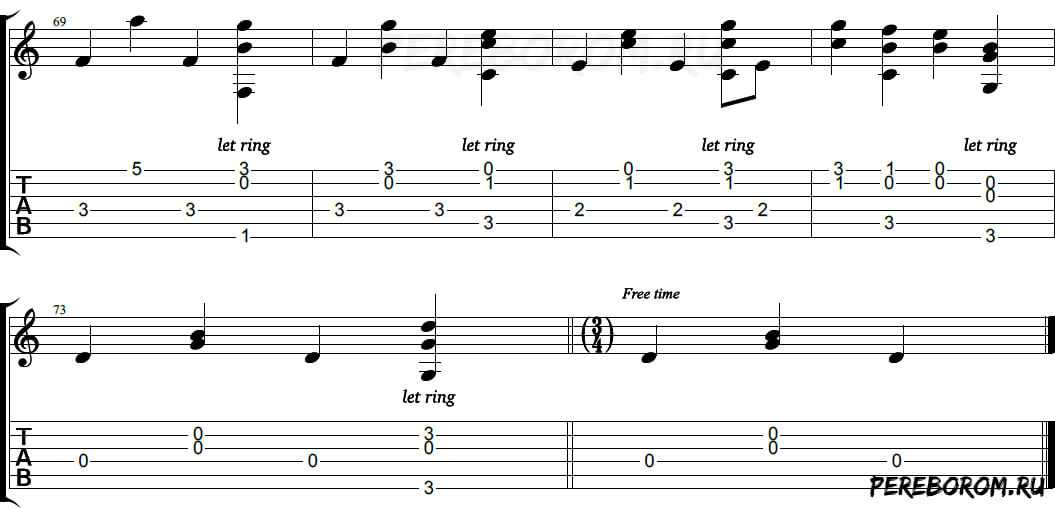 Подобный эпизод присутствует в 60 и 68 такте. Здесь нужно перейти с щипков (59 лад) на 8 лад (14 без капо) и сыграть безымянным-указательным 8 (мизинец левой) – 0 лады, щипнуть безым. и сред. 7 и 0 и сразу перейти на растяжку. Это трудный момент, который нужно отрабатывать отдельно медленно.