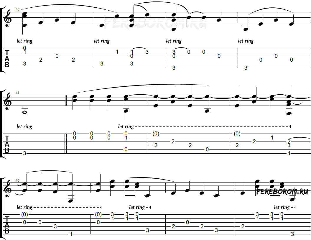 Для исполнения этого варианта не забываем о каподастре на 6 ладу. Здесь попеременно используется приём щипок и перебор. Нечто подобное есть в Californication на гитаре.