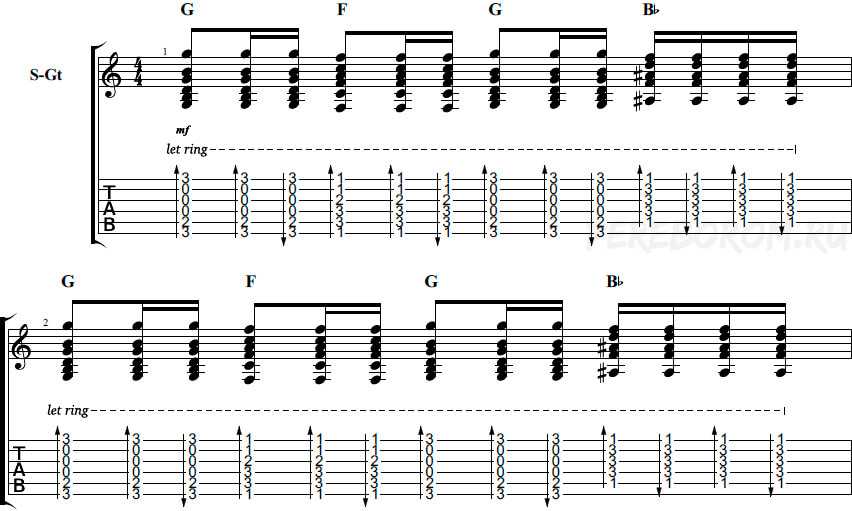 Во вступлении вся загвоздка в быстрой смене аккордов. При этом G-B♭ не очень удобно переставлять в таком темпе. Поэтому если вам тяжело переходить с баррэ на него же, лучше играть G-F на баррэ (чтобы просто передвигать кисть на тон вниз), а дальше аппликатуры аккордов G – B♭ как в табах.