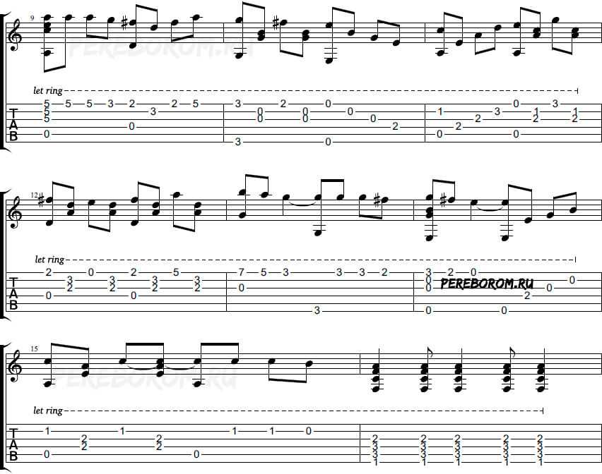 Попробуйте сыграть перебор «восьмёрку» на аккорде Am. После первого полного проигрыша отпустите палец с первого лада второй струны и сыграйте перебор еще раз. Теперь проделайте то же самое без пауз несколько раз.