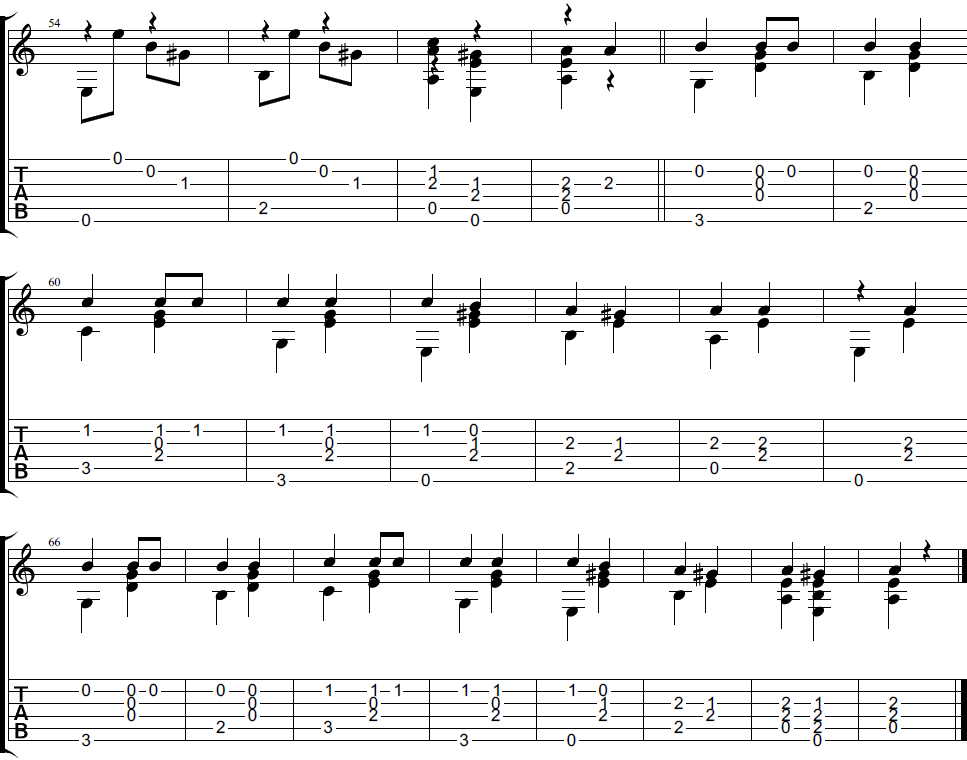 Хорошо, что здесь идёт чередование баса и аккордов. Это упрощает разучивание композиции. Также главная тема повторяется в конце. Мелодию можно разделить на три части – основная тема, припев и небольшой переходный проигрыш (исполняется с использованием простых аккордов Am, E) с исполнением перебора. Также этот приём можно услышать в бумер на гитаре.