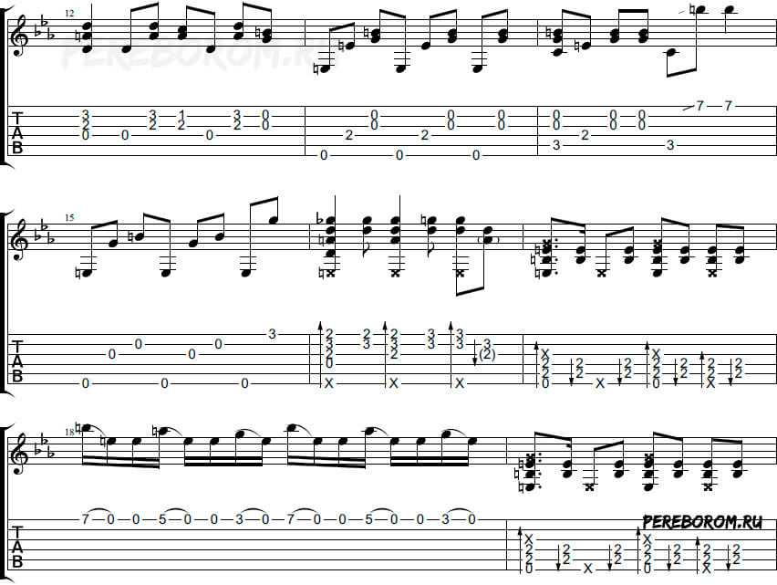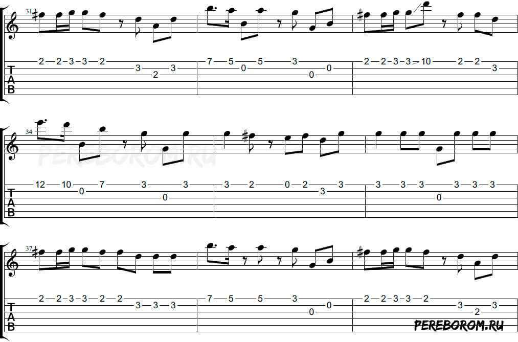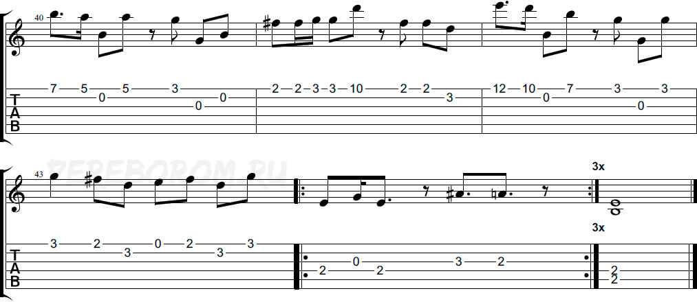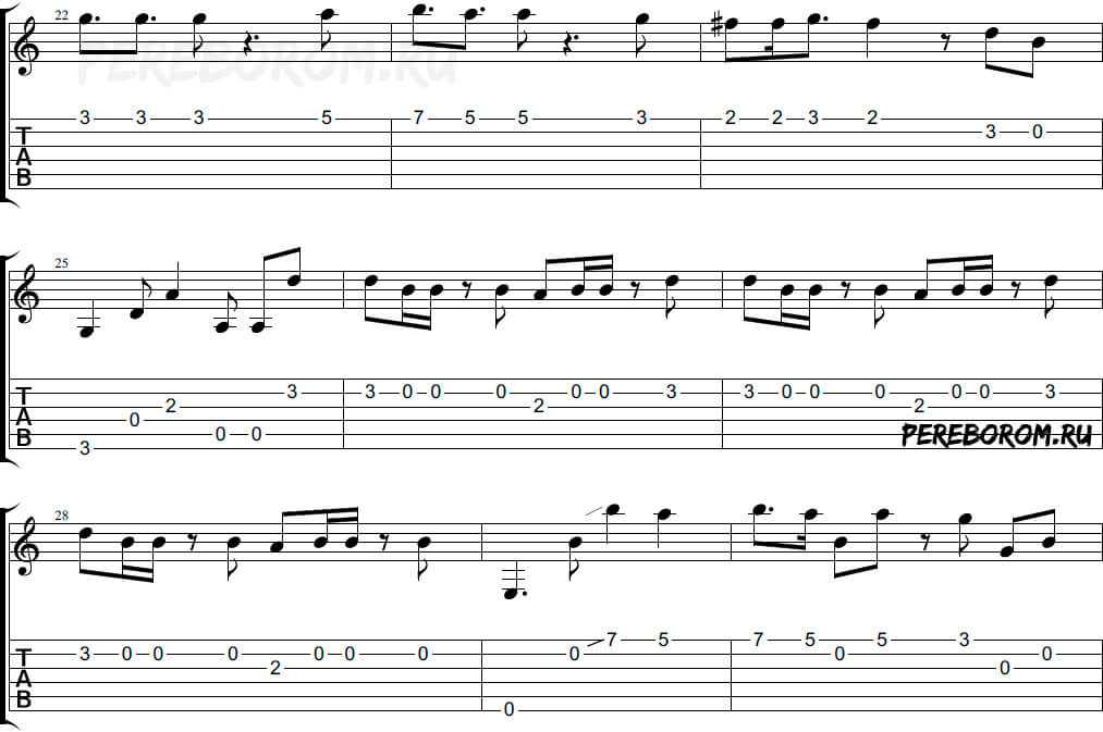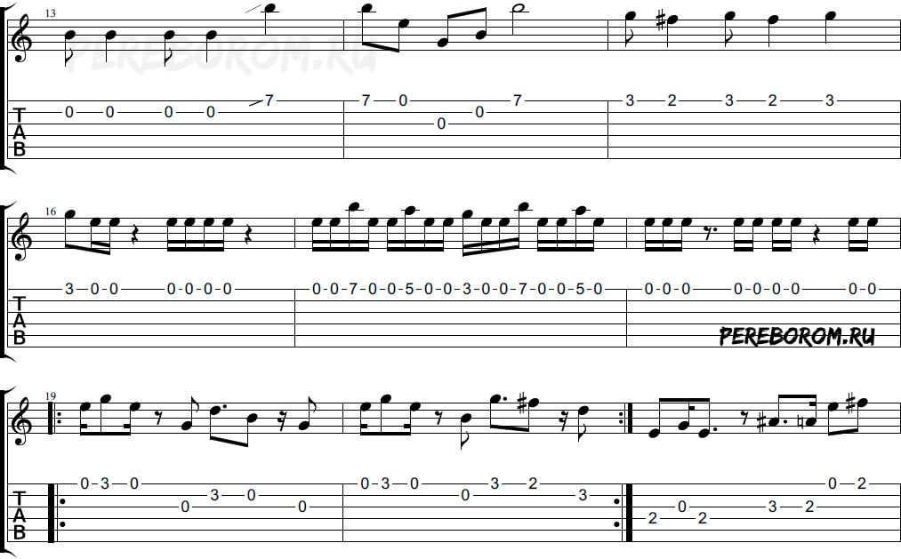 Обратите внимание на dead note «соль#» на первую и третью долю (в Em) – её нужно глушить указательным пальцев левой руки, просто положив подушечку на струну (не зажимать!)