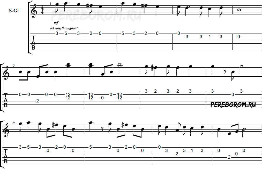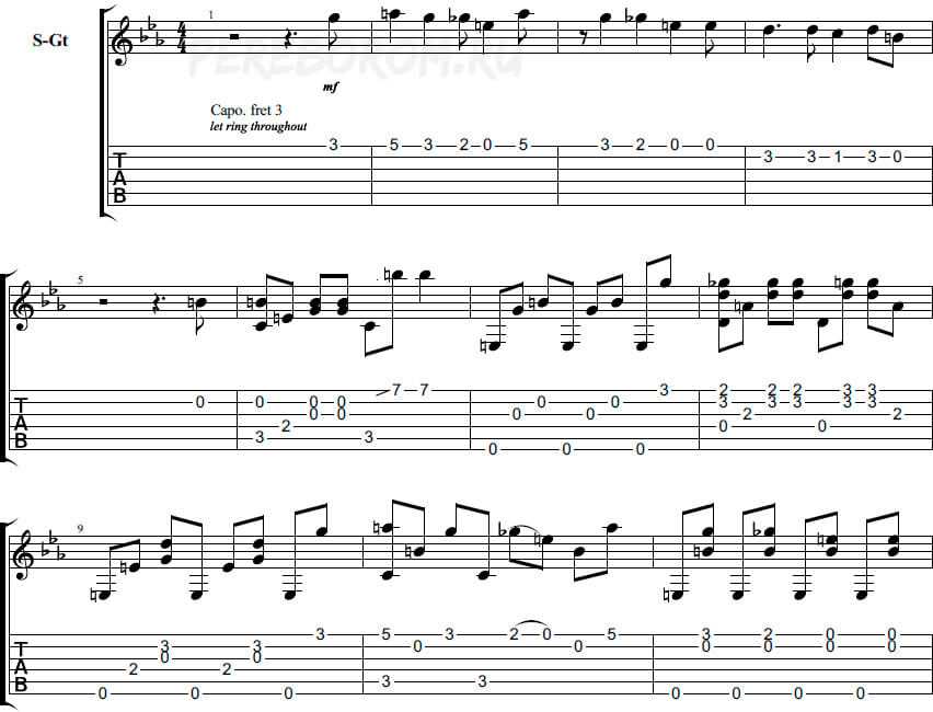 Сам автор использует специальный медиаторный коготь на большой палец (не обязательно). Для упрощения запоминания мыслите аккордами. Там, где присутствуют интервалы, чаще всего есть знакомая гармония. Например, 8 такт – чередование D-Dsus4, 12 – Am-Am4 и так далее.