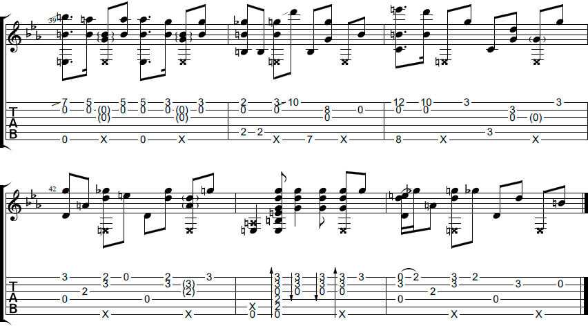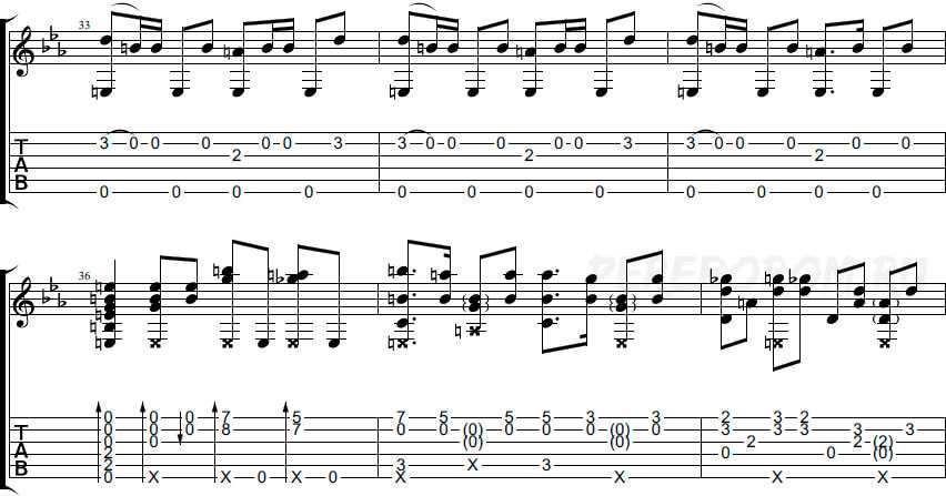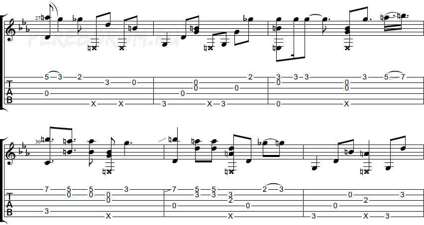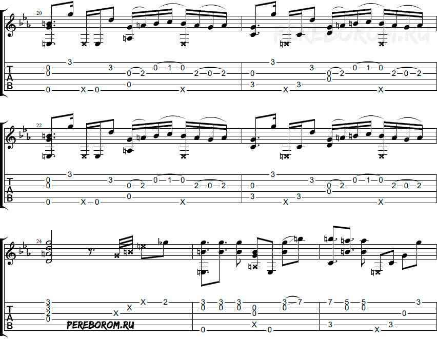 Обратите внимание, что с 26 такта присутствуют мелкие восьмые паузы. Ноты перед ними следует глушить