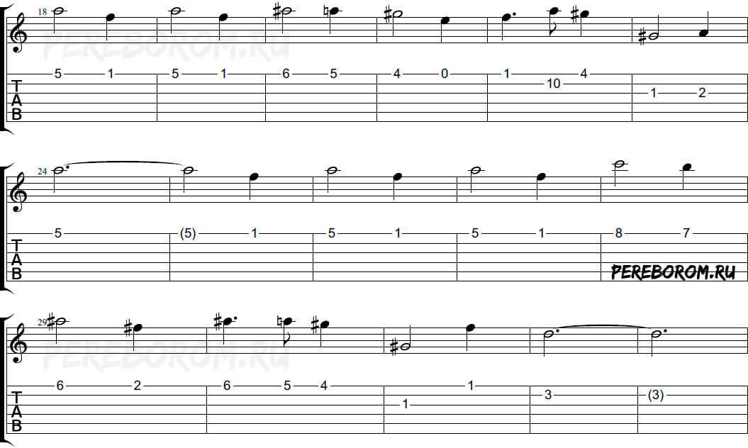 С 25 такта ноту фа# можно извлекать на второй струне 6 лад, чтобы не делать постоянный скачок с 1 на 5 и 8 лады.
