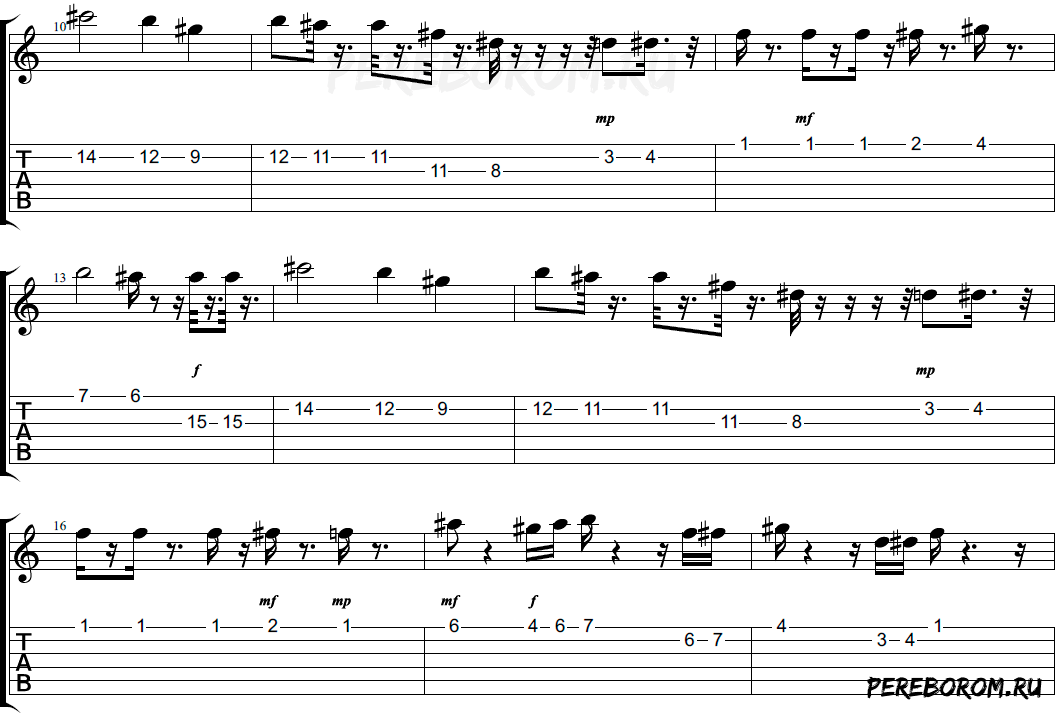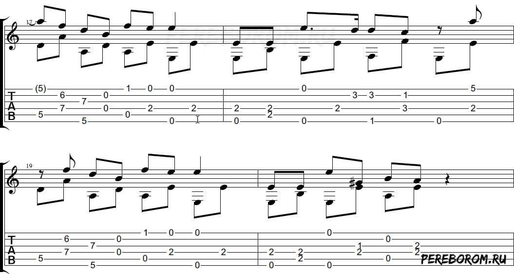 Для начала стоит сказать, что большинство нот играется в высокой тесситуре. Если на вашей гитаре нет выреза (катавэя), то это не слишком удобно. С другой стороны – играть её на электрогитаре не имеет особого смысла в плане накопления исполнительского опыта, но можно и попробовать.