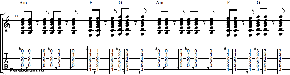Кроме того, припевную часть также можно сыграть боем «Регги». Этот пример хорошо будет дополнять 2-ой вариант боя для куплета с глушением. Основное отличие данного ритма, вы начинаете играть его с глушения струн и делайте акцент на второй удар вверх. Таким образом, обыгрываются все аккорды припева. Здесь самое главное держать темп и не сбиваться в ударах, так вы получите интересный звук и разнообразите свою игру.