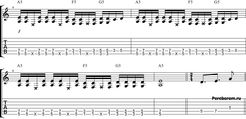 Затем дважды рифф: (ч – пауза) |-F5-/-/-/-/-/-/-C5-|—/-/-/-/-/-/-/-| |-B5-ч-/-ч-F5-B5-ч-/|-ч-B5-/-/-/-/-/-/|