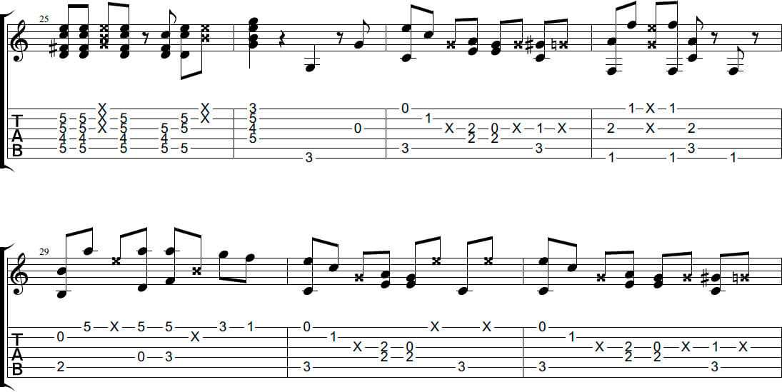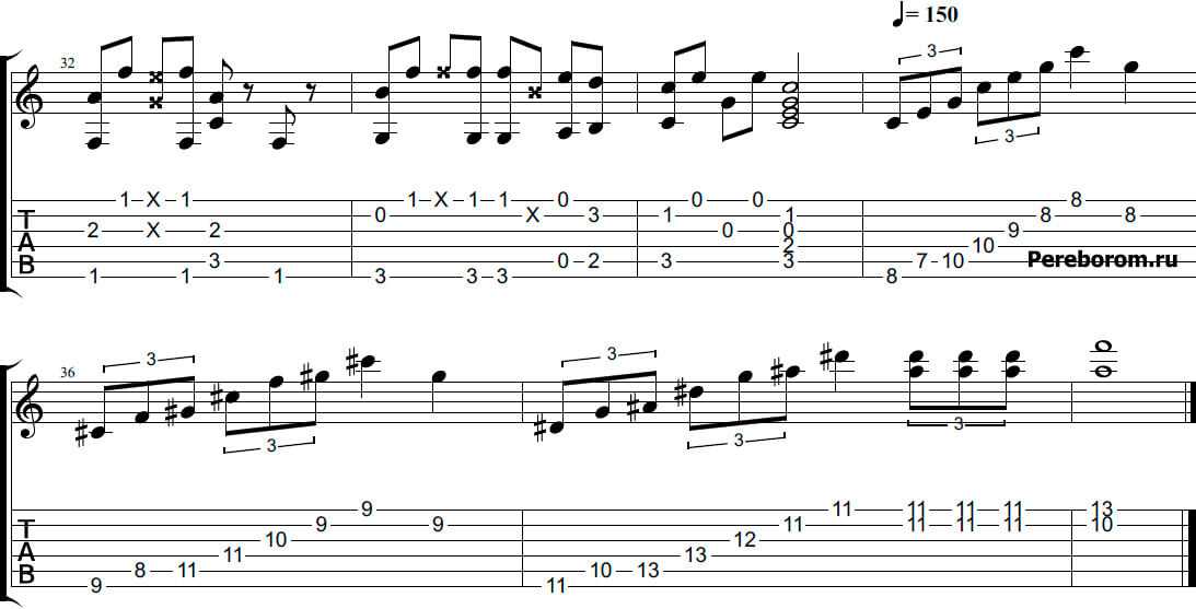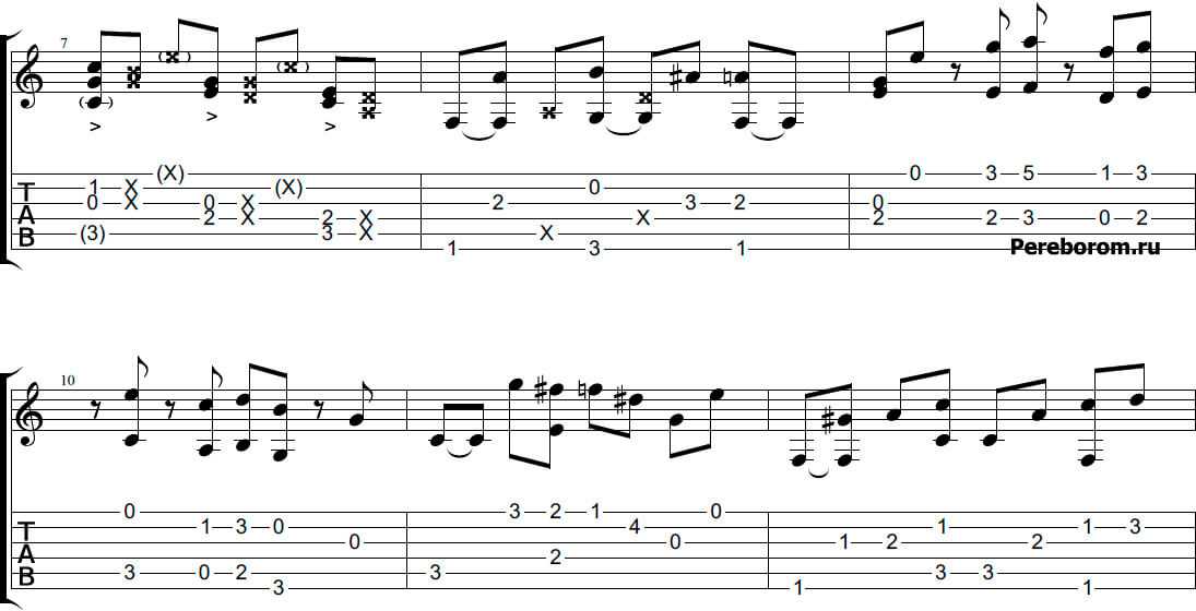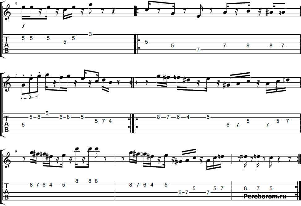 Благодаря тому, что марио на гитаре – мелодия, что называется, на слуху, разбирать её легко. Удивительно, но она состоит из двух длительностей – 16-еы и 8-ые. Хитросплетение опять же 16-ых и 8-ых пауз позволяет создать ощущение постоянного спуска и подъёма по препятствиям (что и происходит в игре)