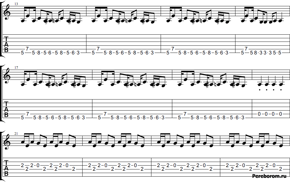 В третьей части (самая «файтинговая» и скоростная) требуется растяжка пальцев на гитаре. Скачки 5-8, 5-6 на 6 струне и 5-7 (шестая-пятая) выполняются при помощи мизинца, безымянного и среднего пальцев. Поэтому темп в 130 ударов в минуту слишком сложен для разучивания. Рекомендую взять вдвое меньше (65-70). Так ваши пальцы запомнят необходимые движения. После этого можно потихоньку прибавлять скорость.