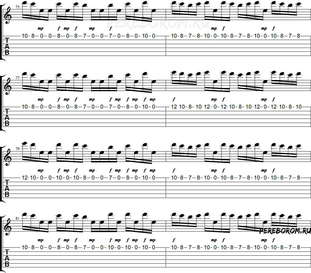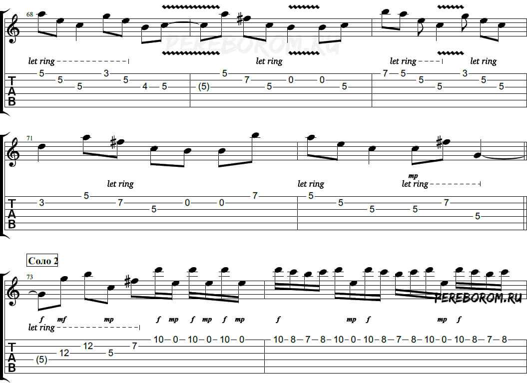 В первом куплете используются одинаковые ноты, которые играются по пять штук (послушайте сольную партию отдельно). Достаточно выучить, что на 12 ладу мы ставим безымянный на 3 струну, а мизинец на 4. Потом мы двигаем их на 7 лад. Указательным пальцем играем 5 лад на третьей струне. В 10 такте можно поставить малое баррэ на 5 лад 2-4 струны.