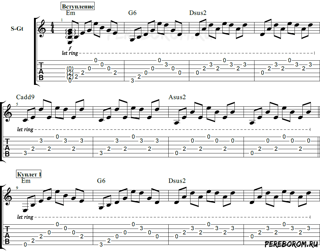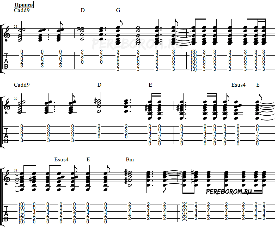 В песне используются sus аккорды и add аккорд, что придаёт ей узнаваемое звучание. Если в аккорд не входит какая-либо нота, то она не используется в переборе. Cadd9 – 5-4 – вниз; 3- — вниз; 2 – вверх; 1-2 – вверх; 4 – вниз; 2 – вверх (впрочем, это не обязательное условие, можно играть как удобно, это лишь как вариант).