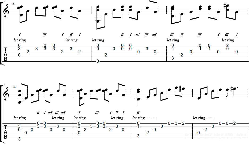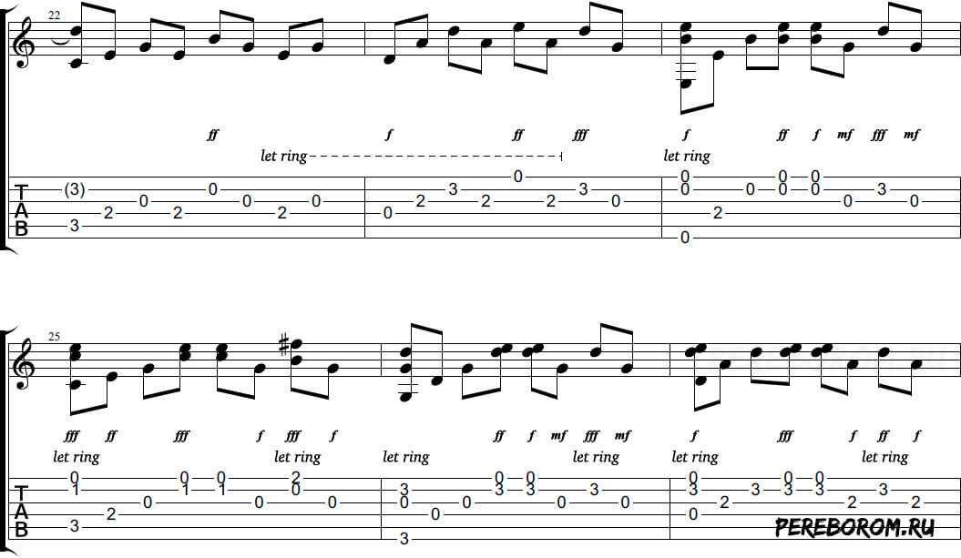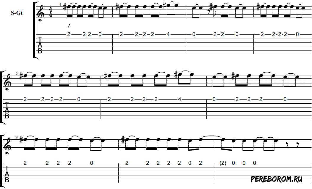 Эта акустическая версия выполнена в более балладном стиле, в отличии от жёсткого альтернативного оригинала. Но в ней есть другой момент, который добавляет нерва и чувственности – это динамические штрихи. Куплет проходит более ровно, зато прехорус и припев наполнены «форте», «двойным форте» и «фортиссимо». Рекомендуем соблюдать эти обозначения, чтобы добавить разнообразия в вашу игру. Не обязательно чётко соблюдать указания в табулатурах, можно использовать свой вариант динамики. Похожие моменты также используются в драматичных произведениях вроде Реквием по мечте на гитаре.