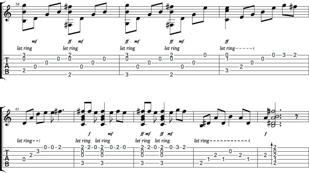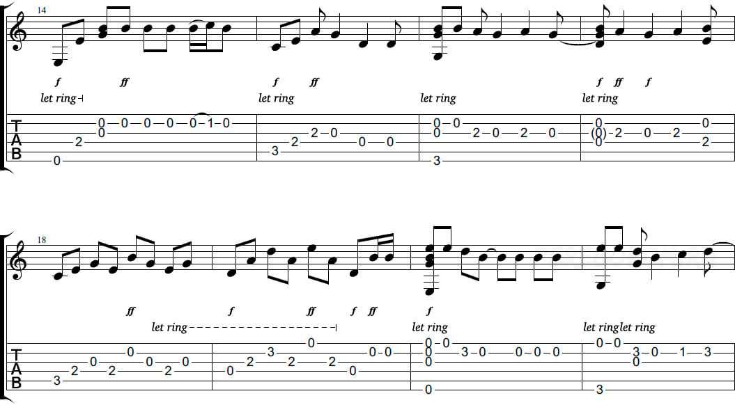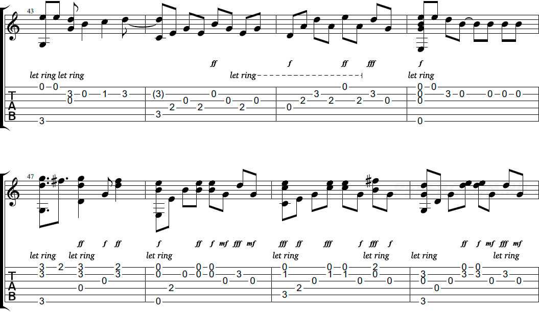 В десятом и некоторых последующих тактах мы встречаем мелодию, повторяющуюся на одной струне. В этих отрезках нужно обязательно чередовать пальцы правой руки. Обычно это указательный и средний, но может подключаться и безымянный.