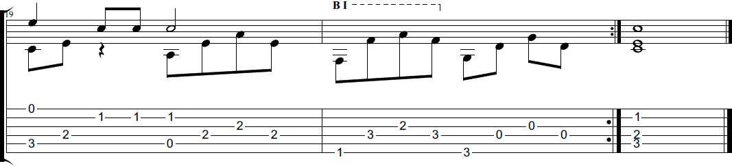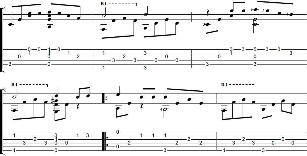 Также здесь несколько раз встречается баррэ на первом ладу и в припеве подключается средний голос.
