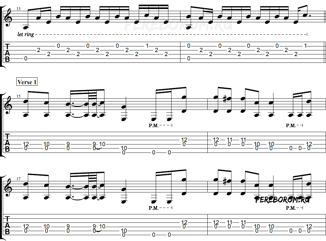 Как ни странно, но классические виды переборов на гитаре закончились. Но! В качестве бонуса мы рассмотрим перебор из Street Spirit (Fade Out) и Nothing Else Matters. Откровенно говоря, они не очень сложны, но очень красивы, так что — вперёд!