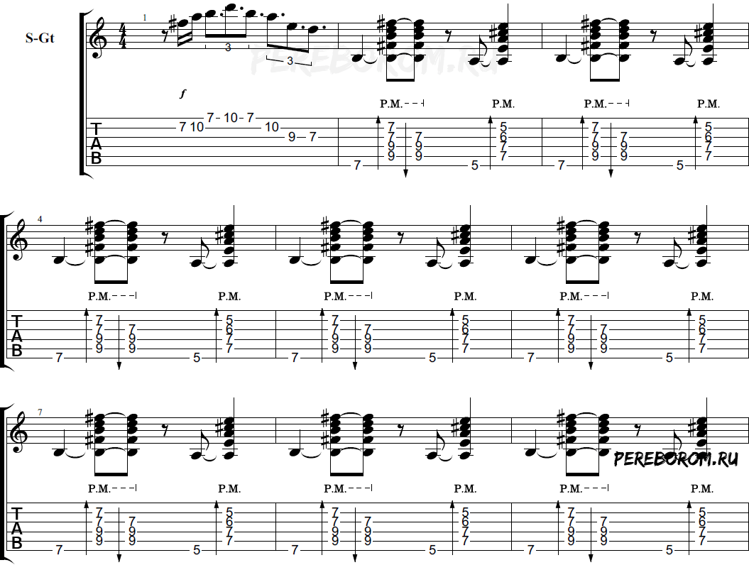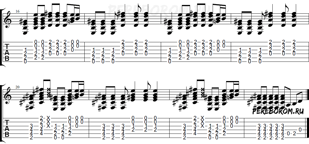 Вторая фраза повторяет первую за исключением концовки. Также вы можете исполнить начальный мелодический ход более резким арпеджио. В конце 2-2 зажмем средним, а 4 – мизинцем. При этом указательным добавим «си» – 2 лад пятой.