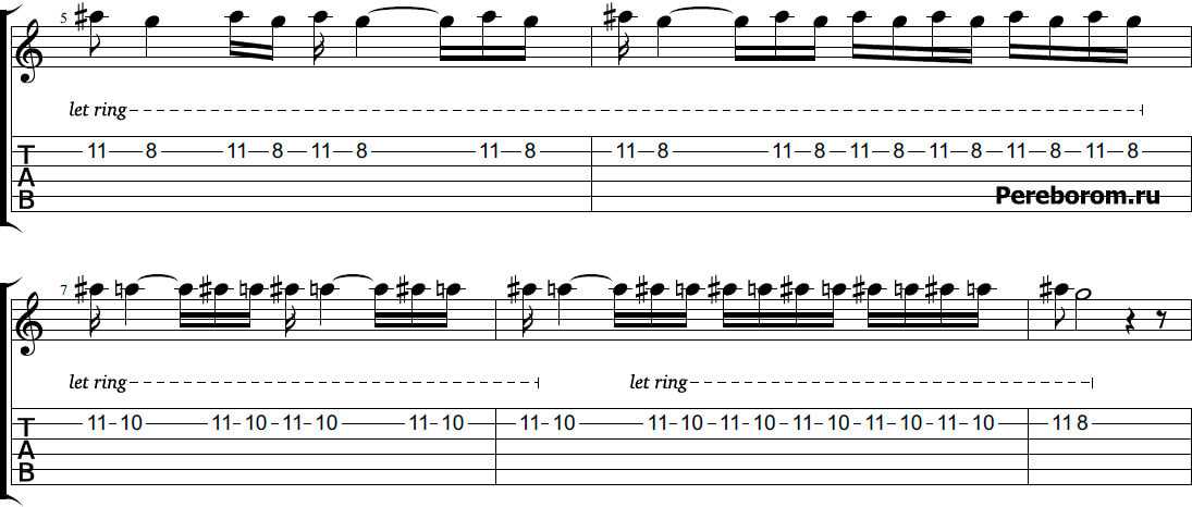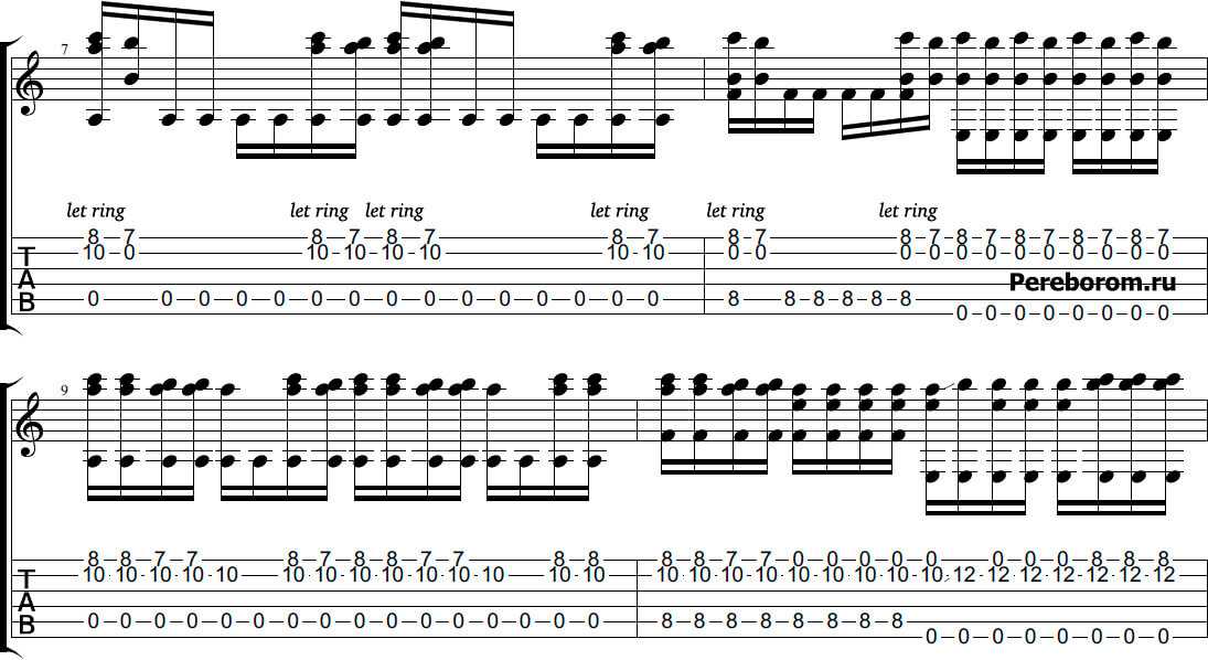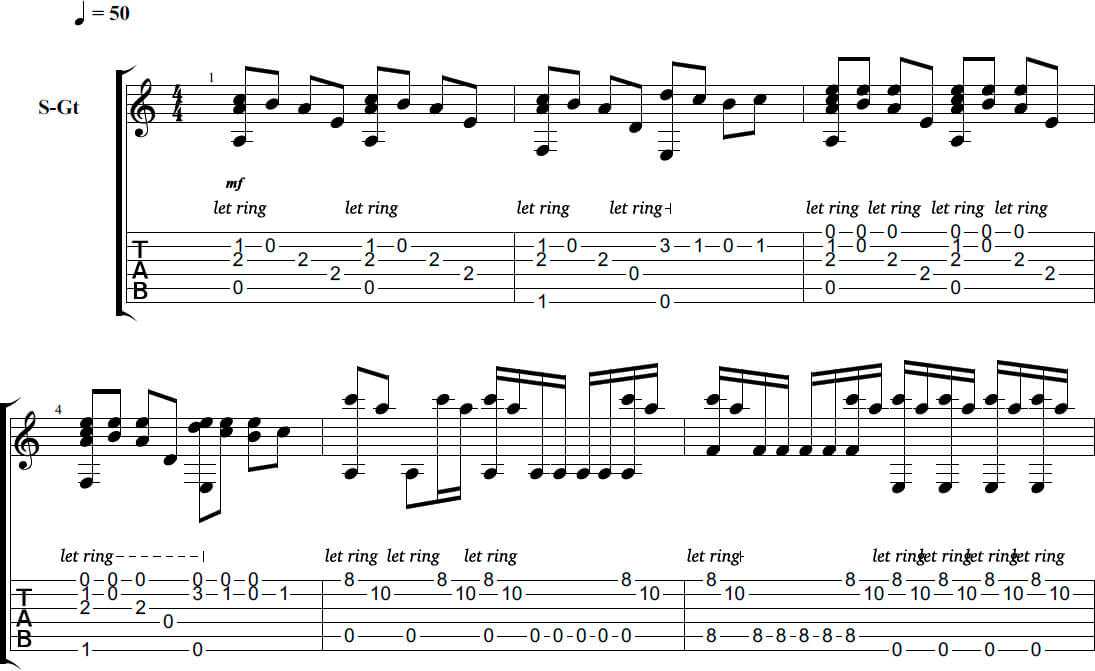 Во второй половине стоит обозначение «let ring». Оно означает, что ноты не отпускаются, не глушатся, а звучат подряд, как бы «наслаиваясь». Это наиболее слышно на фортепиано, но на гитаре с хорошим сустейном также будет заметно.