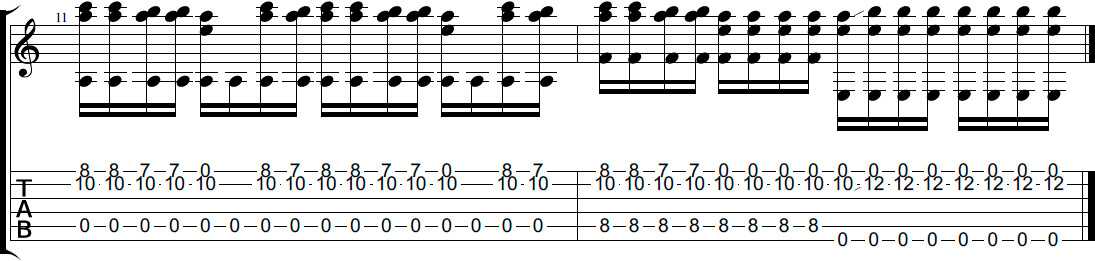 Начиная со второго такта нужно запомнить аккордовые последовательности, так как чередование гармоний идёт довольно быстро. Вторая половина строится вокруг аккорд f, взятого на 8-ом ладу. Баррэ зажимать не придётся, но верхний интервал «ля-до» так запомнится лучше. Сочетание «ля-ми» (8-10 — первая и вторая струны соответственно) будет меняться на «до-си» (7-10) и «си-си» (7-0). Это делается сдвигом указательного пальца с 8 лада на 7-ой (первая струна). Также здесь есть «до-си» (8-0). Последовательность их этих четырёх интервалов нужно поиграть отдельно, а потом добавлять басовую партию.