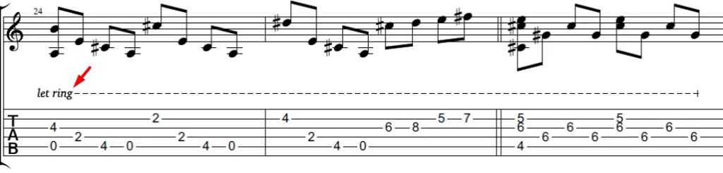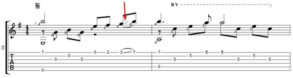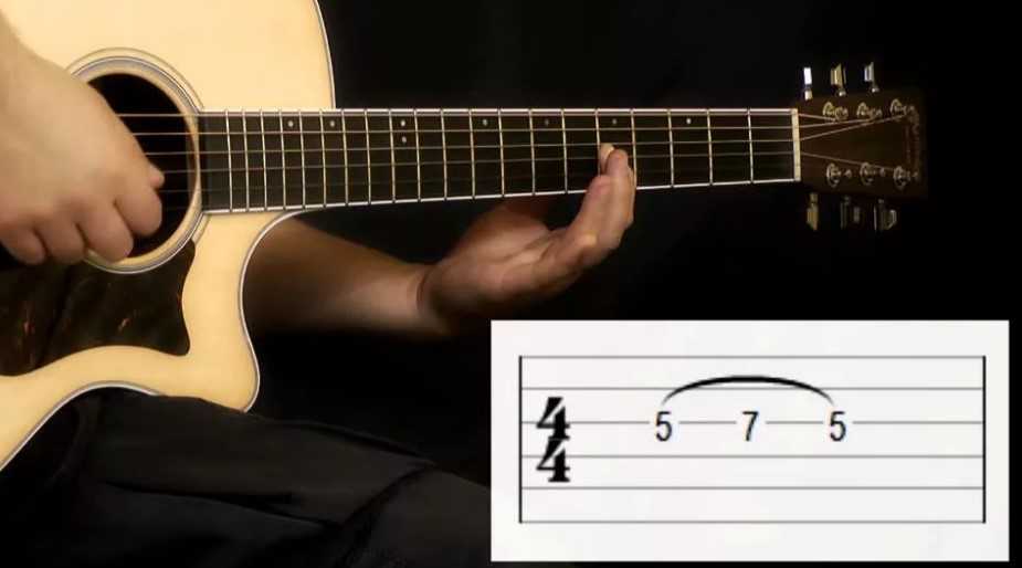 Лига в табулатурах и нотах обозначается дугой, идущей от одной ноты к другой. Или же от одного аккорда к другому. Она обозначает объединение двух или более нот, в одну. Если вы видите залигованную ноту, то значит, вы играете её только один раз, но держите столько долей такта, сколько указано в табах или нотах.