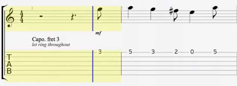 Если присмотреться, то в 1-2 и 9-10 тактах находится знакомый нам аккорд Dm. Затем спрыгиваем мизинцем на 5 лад. В 6 такте опять используем аппликатуру, как в неполном Dm. 2-4 (7 такт) – средний-мизинец и заканчиваем на ноте ля указательным.