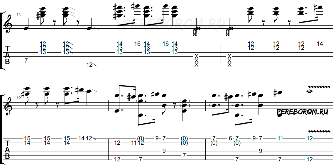 Затем играем аккордику в верхнем регистре. В 13 такте предлагаем взять малое барре на 2 струны указат., а сред. зажать 13 лад. Первый раз щиплем, а второй щиплем и делаем небольшой слайд вниз на произвольную длину – например, на 2-3 лада, чтобы не уводить руку далеко (дальше нужно сыграть аналогичный слайд на 12 л. шестой стр.). Затем также можно взять малое барре на 1-3 струны (13 лад), средним зажать 14, а 16 играть безымянным или мизинцем. Можно без баррэ – тогда указ. и сред. кладём на 13 лад вторую и третью ст. По глушёным басам ударяем сверху вниз – они должны прозвучать довольно громко, так как являются элементом ритма.