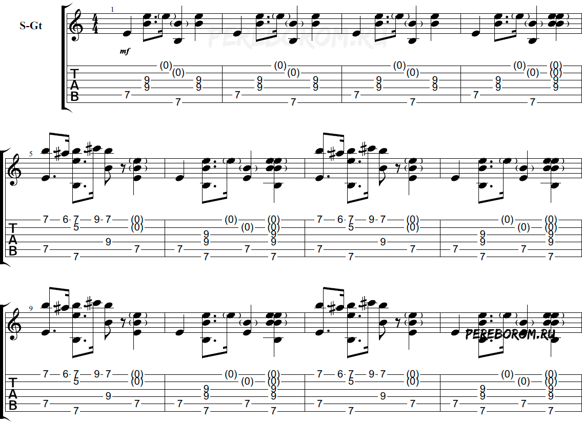 Во вступлении используется щипок на гитаре. Играем бас 7 на пятой струне, а затем щиплем правой рукой 4 и 3 стр. на 9 ладу. Чтобы играть по очереди 7 лад на 5 и 6 стр., зажмите малое барре первой фалангой указательного пальца.