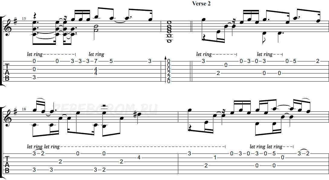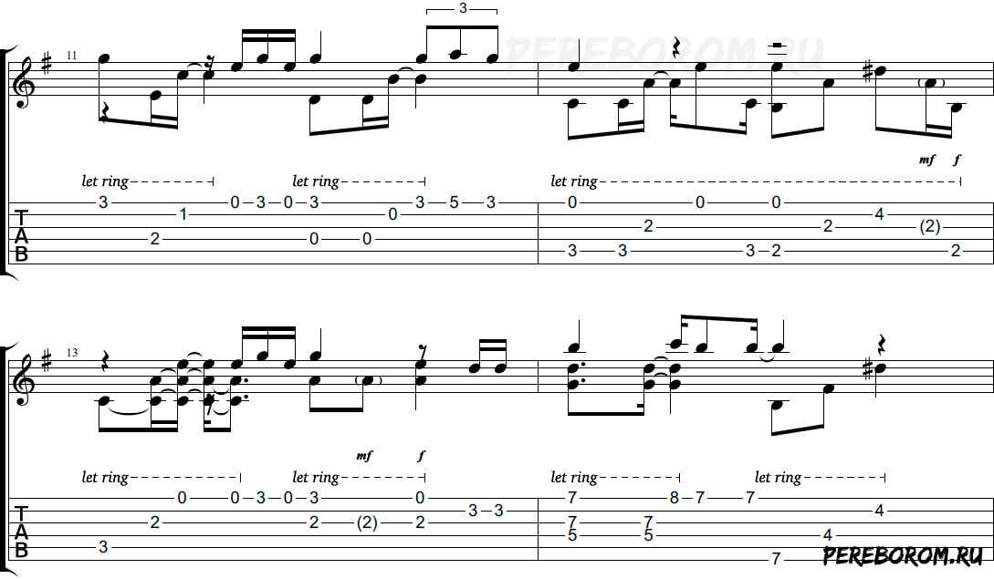 Куплеты состоят из того же аккомпанемента, но с добавленной вокальной мелодией. Если вы хорошо разучили вступление, то постепенно сможете сыграть мелодию вместе с басом. В некоторых местах удобно будет применить баррэ – например, 10 такт – баррэ на 3 ладу, а нота ля (5) достаём безымянным или мизинцем.