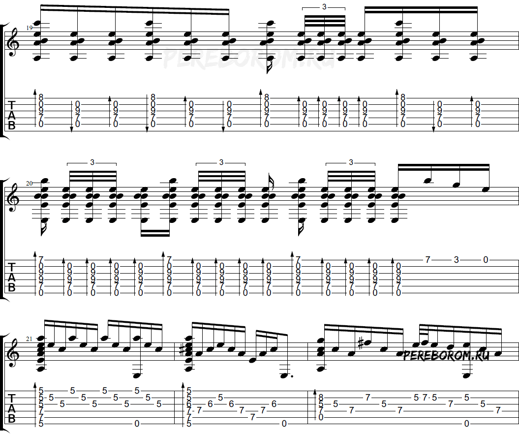 С 17-го по 20-ый такт вам нужно будет играть боем, обычным переменным штрихом вниз-вверх.