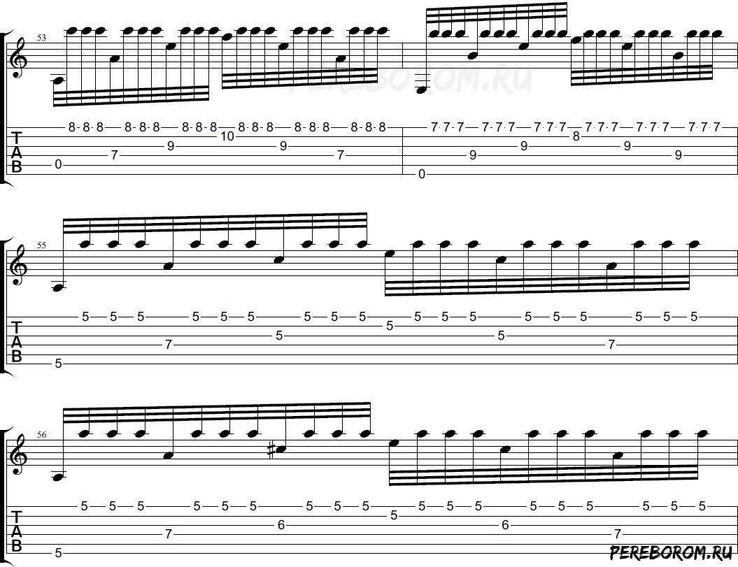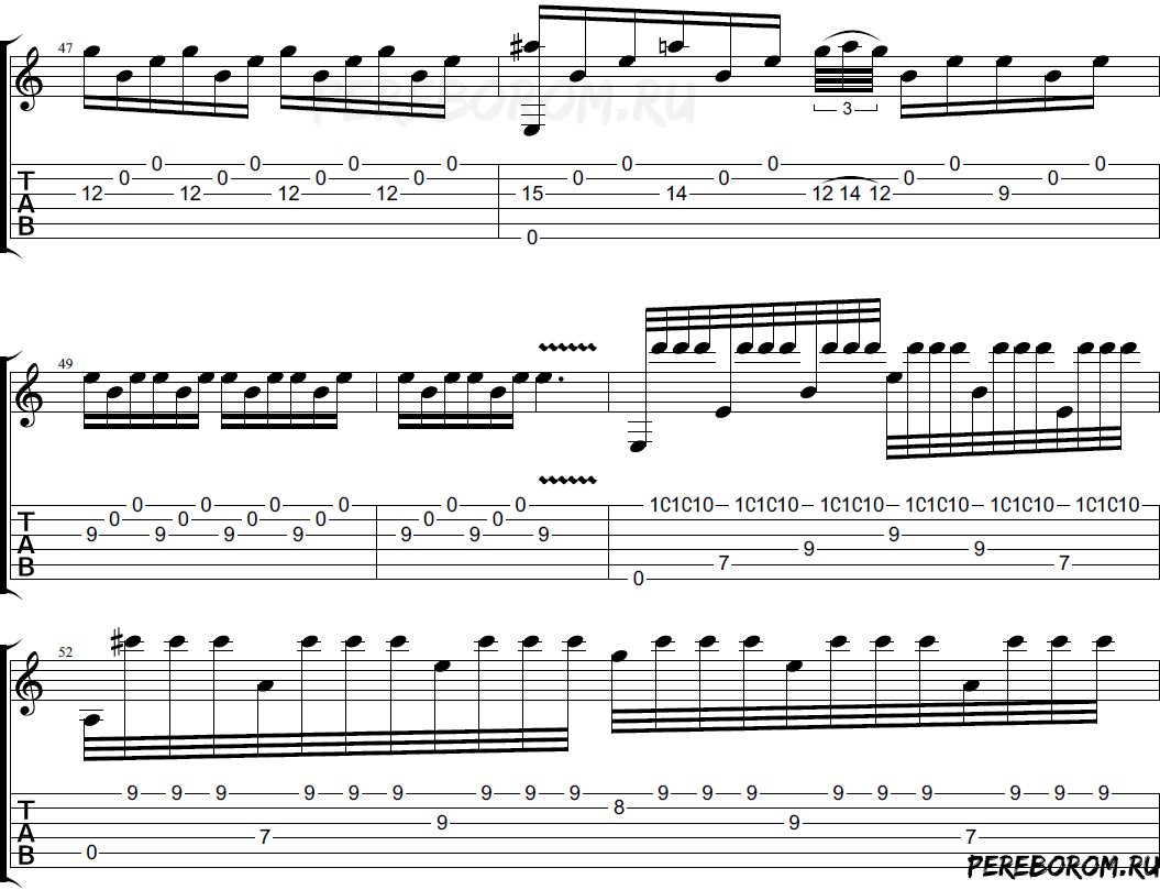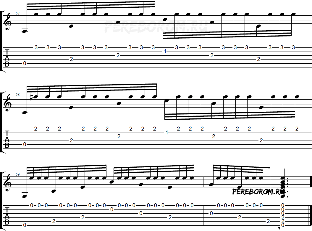 В конце, с 51-го по 60-ый такт, вам нужно играть тремоло пальцами, при этом параллельно играя басовую линию. Это – наверное, самый сложный момент всей композиции, поскольку вам потребуется координировать действия отдельных пальцев, чтобы каждый из них играл ровно. Мы настоятельно рекомендуем не пытаться взять этот отрывок с наскока, и сначала играть его в несколько раз медленней, постепенно наращивая темп.