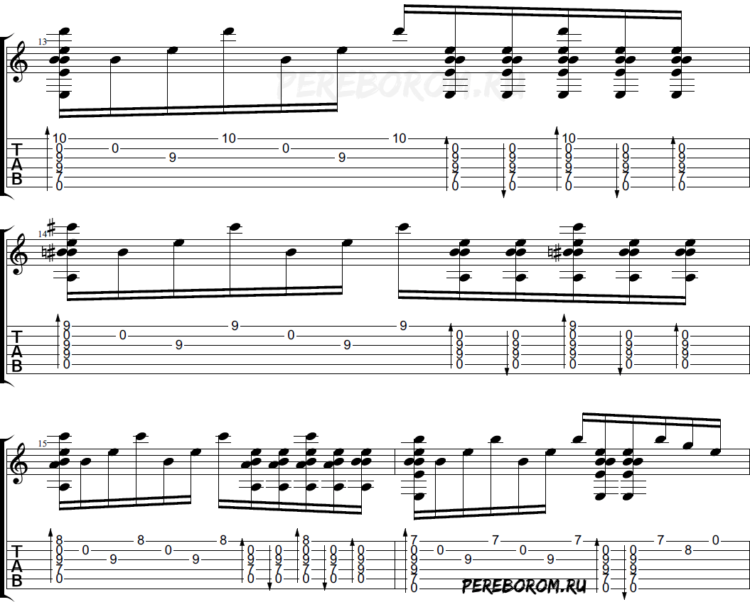 Начиная с 11-го квадрата вам потребуется одновременно играть аккорды, и перебор. Начало почти каждого такта здесь – удар по какому-то аккорду. Подобные переходы с боя на перебор потребуют сноровки и тренировок, скорее всего вам придется сыграть эти моменты медленно.