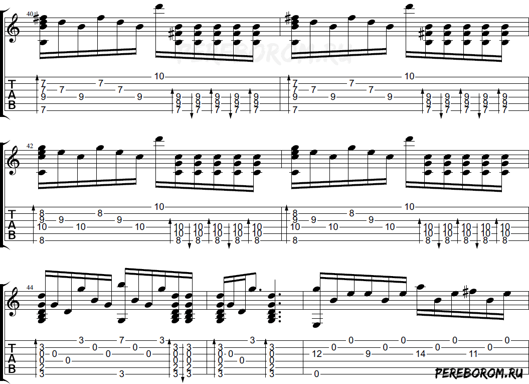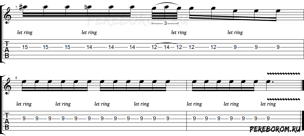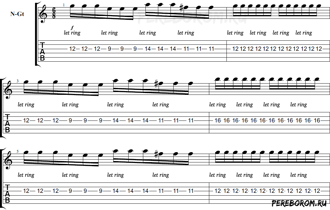 Интерес здесь представляет разве что седьмой такт, в середине которого потребуется сыграть 12-й лад, потом приемом хаммер-он зажать 14-й, и пул-оффом снова сыграть 12-й. Сделать это нужно быстро, и вам потребуется некоторая сноровка, чтобы исполнить этот момент правильно.