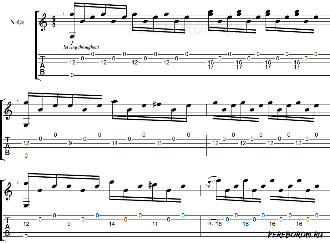 Фингерстайл вариант The Last of Us намного сложнее, и потребует от вас сноровки, терпения и внимания к деталям. Интересные моменты начинаются уже на шестом такте, где вам потребуется сыграть призрачную, еле слышимую ноту на 14 ладу, и потом очень быстро заставить зазвучать 16. В остальном это обычный фингерстайл-перебор, наподобие того, что можно услышать в Скайриме на гитаре. Кроме этого, здесь так же присутствуют легато, например, на 9-ом такте.