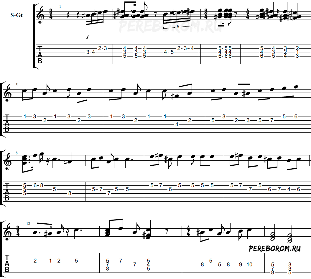 Ходы вроде 9 такта лучше играть: «5-7» на третьей указат. и безым, а на 7 (4 струна) переходим средним. В 11 такте «6-7-4-6» — ср.-без.-указ.-средний. Пожалуй, самый неудобный аккорд здесь – это 13 такт. 5 (указ) – 7 (средний) – 8 (мизинец). Это сделано, чтобы взять безымянным пальцем 7-ой лад на 3 струне. Чтобы было проще, можете не зажимать бас 8 и играть указ-ым и средний «5-7».