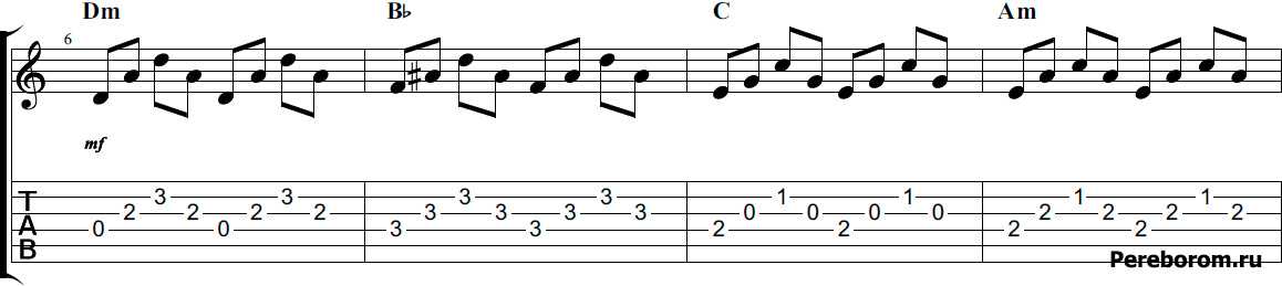 Тихий и спокойный перебор, подходит для атмосферного исполнения песни Зеленоглазое такси на гитаре. Задействованы по три струны от каждого аккорда. Бас всё время исполняется на 4-ой (большим). Указательный и средний «задумчиво» перебирают последовательно 3-2-3. Такой перебор подходит для тренировки медиатором. В комбинации «3-2-3» 3-я струна за вторым разом играется «вверх».