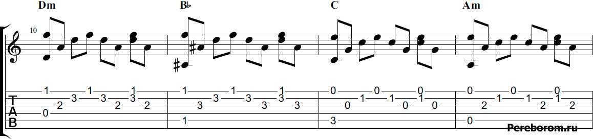 Это не единственный вариант игры перебором, но самый простой. Для проигрыша аккорда перебором сперва извлекается главный звук комбинации на третьей-четвертой струне, и далее оставшиеся звуки на второй и первой струнах. Игра перебором должна звучать плавно, без резких переходов и потому считается что ее изучать сложнее чем игру боем.